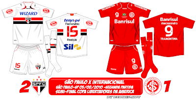 Estes foram os kits usados na semi-final onde enfrentamos um velho e conhecido rival, o poderoso São Paulo. No primeiro jogo o Inter foi mais ofensivo, e o placar acabou não refletindo o que foi a partida, Giuliano marcou e levamos a vantagem para o Morumbi. Nestas semi-finais foram usadas na camisa uma bandeira do Brasil no peito com as inscrições do jogo; adversário, competição, data e local.